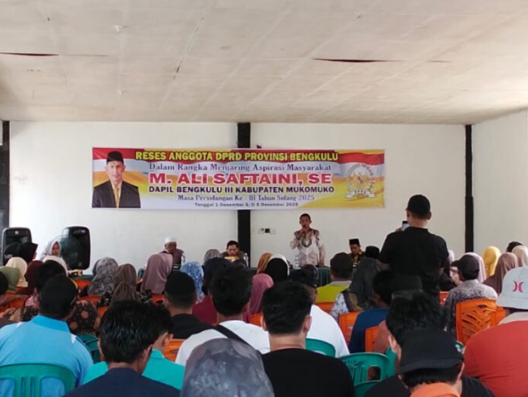 Mukomuko, CoverPublik.com – Anggota DPRD Provinsi Bengkulu, M. Ali Saftaini, menjalankan kegiatan reses masa persidangan III tahun 2025 pada 3–5 Desember 2025. Legislator dari Daerah Pemilihan Bengkulu III yang meliputi Kabupaten Mukomuko itu turun langsung ke masyarakat untuk menjaring aspirasi terkait kebutuhan pembangunan daerah.