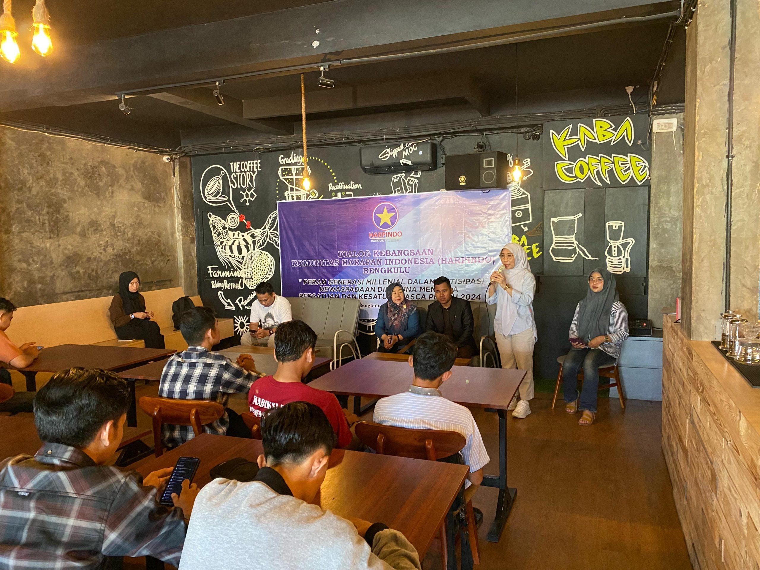 Dalam rangka menjaga Persatuan dan Kerukunan Pasca Pemilu 2024, Komunitas Harapan Indonesia (Harpindo) Bengkulu melaksanakan Dialog Kebangsaan di Kaba Caffe, Kota Bengkulu, Provinsi Bengkulu pada Sabtu (2/3/2024)
