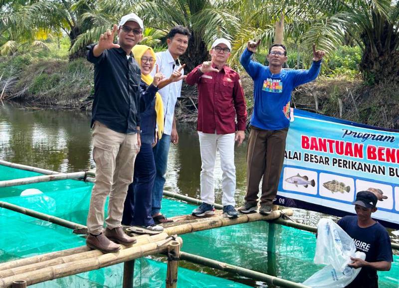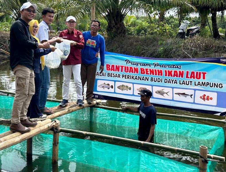 Seluma, CoverPublik.com – Asisten Pemerintahan dan Kesejahteraan Rakyat (Kesra) Sekretariat Daerah Kabupaten Seluma, H. Hendarsyah, S.IP, MT, didampingi Kepala Dinas Perikanan Seluma, Zuraini, SP, M.Si, menghadiri acara pemberian bantuan 80.000 bibit ikan kakap putih dari Balai Besar Perikanan Budidaya Laut (BBPBL) Lampung kepada kelompok budidaya ikan air payau KUB Samudera Kungkai Jaya di Desa Kungkai Baru.