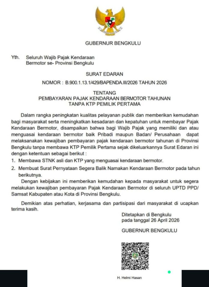 Kebijakan tersebut tertuang dalam Surat Edaran Nomor B.900.1.13.1/429/BAPENDA.III/2026 Tahun 2026 tentang pembayaran pajak kendaraan bermotor tahunan tanpa KTP pemilik pertama, yang ditujukan kepada seluruh wajib pajak kendaraan bermotor di Provinsi Bengkulu.