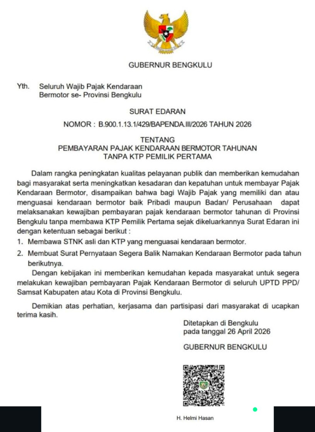 Bengkulu, CoverPublik.com – Gubernur Bengkulu Helmi Hasan menerbitkan surat edaran yang memberikan kemudahan bagi masyarakat dalam membayar pajak kendaraan bermotor tahunan tanpa harus melampirkan KTP pemilik pertama.