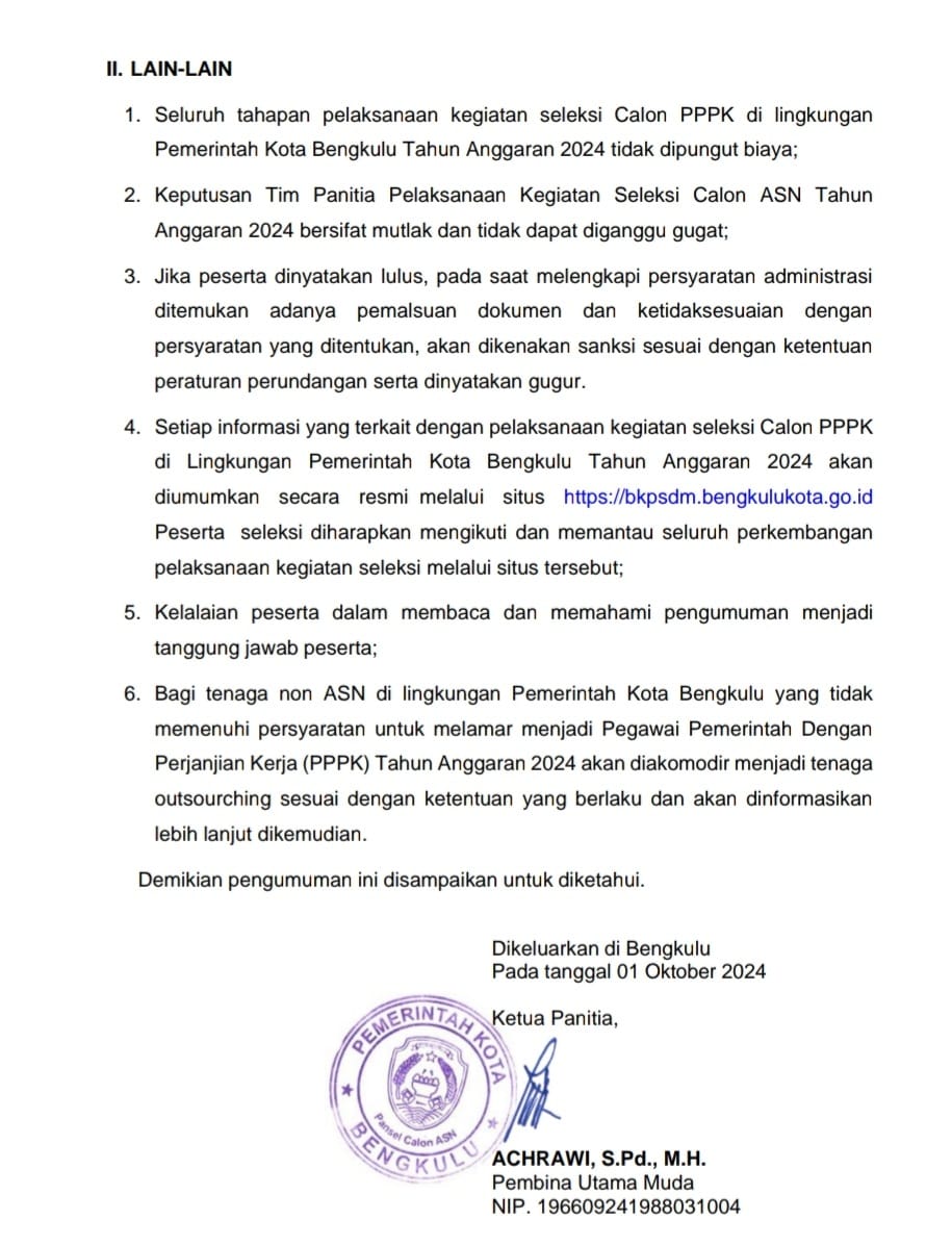 Untuk informasi lebih lanjut, para pelamar dapat melihat pengumuman Nomor : 800.1.2/04/PANSEL.BKL tentang Seleksi Pengadaan Calon Pegawai Pemerintah Dengan Perjanjian Kerja (CPPPK) di Lingkungan Pemerintah Kota Bengkulu Tahun Anggaran 2024. (Ads)