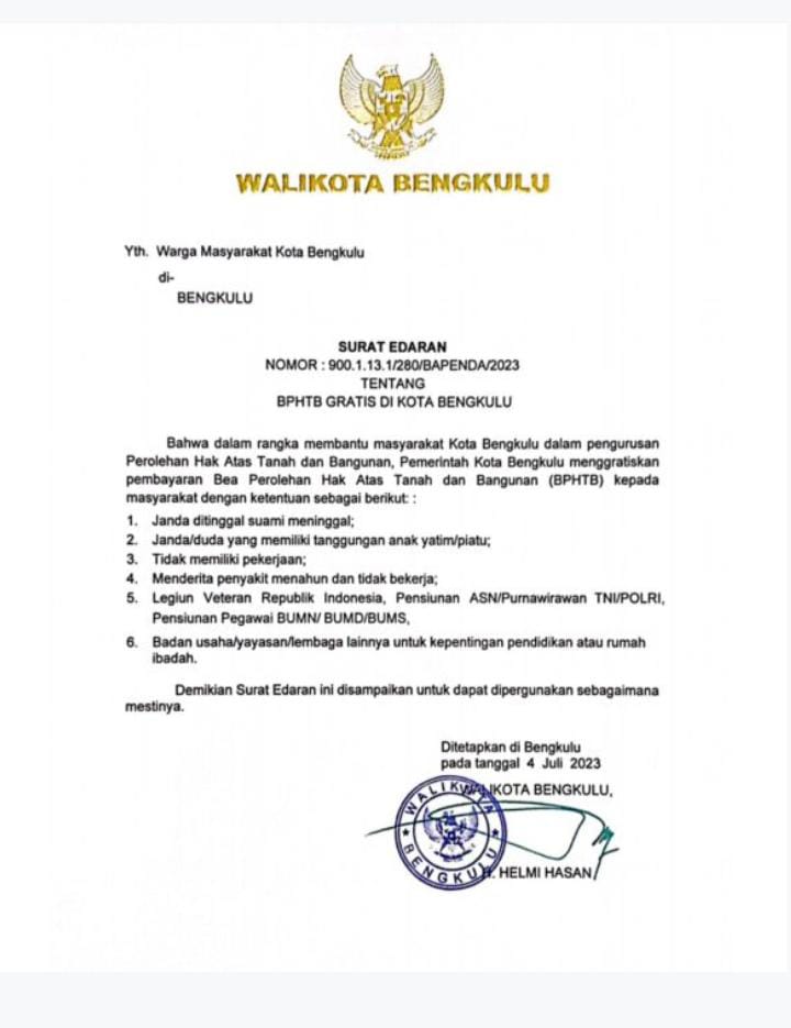 “SE ini untuk membantu masyarakat Kota Bengkulu dalam pengurusan Perolehan Hak Atas Tanah dan Bangunan,” tulis Walikota Helmi.