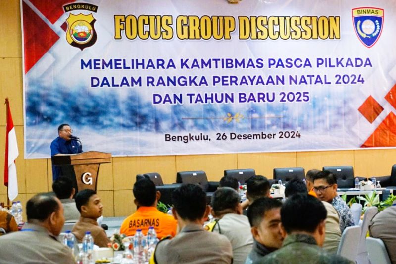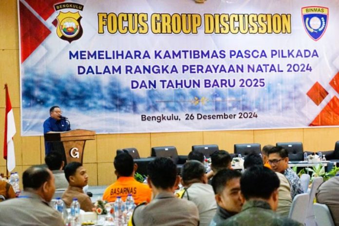 CoverPublik.com – Pj Walikota Bengkulu Arif Gunadi hadir sekaligus membuka acara Focus Group Discussion (FGD) yang diselenggarakan oleh Polresta Bengkulu dengan topik pembahasan yakni Memelihara Kamtibmas Pasca Pilkada dalam Rangka Perayaan Natal 2024 dan Tahun Baru 2025, di Grage Hotel Bengkulu, Kamis (26/12/24).