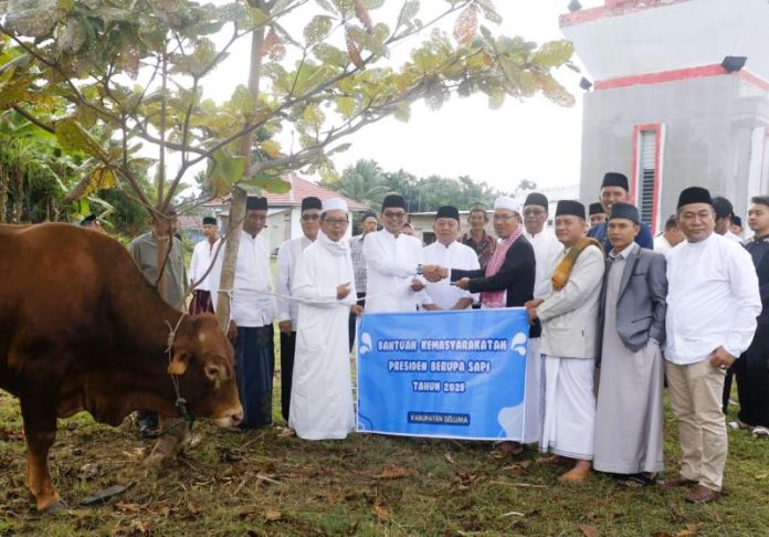 Seluma, CoverPublik.com – Momen Idul Adha 1446 Hijriah menjadi berkah tersendiri bagi masyarakat Kabupaten Seluma. Bupati Seluma, Teddy Rahman, S.E., M.M., dan Wakil Bupati, Drs. Gustianto, menyalurkan bantuan hewan kurban dari Presiden Republik Indonesia, Prabowo Subianto, dan Gubernur Bengkulu, Helmi Hasan, kepada masyarakat Kabupaten Seluma, Jumat (6/6/2025).