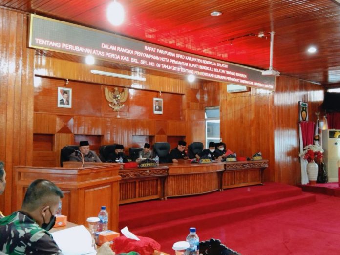 Agenda paripurna DPRD ini dilaksanakan dalam rangka penyampaian nota pengantar Bupati Bengkulu Selatan terkait rancangan peraturan daerah tentang perubahan atas peraturan daerah Kabupaten Bengkulu Selatan Nomor 09 Tahun 2016 tentang Pembentukan Susunan Perangkat Daerah Kabupaten Bengkulu Selatan.