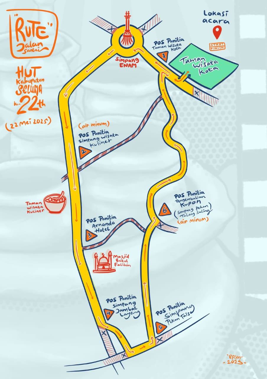 Rute jalan santai akan mengelilingi kawasan kota dan berakhir kembali di Taman Wisata Kota Seluma, yang juga akan menjadi pusat kegiatan hiburan dan pembagian hadiah. Para peserta diimbau untuk hadir lebih awal dan mengenakan pakaian yang nyaman.