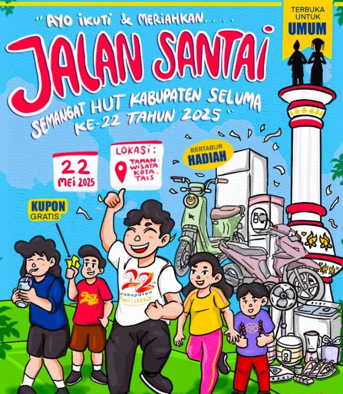 Seluma, CoverPublik.com – Dalam rangka memperingati Hari Ulang Tahun (HUT) ke-22 Kabupaten Seluma, Pemerintah Daerah Kabupaten Seluma akan menyelenggarakan kegiatan Jalan Santai Bertabur Hadiah yang terbuka untuk seluruh masyarakat. Kegiatan ini dijadwalkan berlangsung pada Kamis, 22 Mei 2025, dengan titik start dan finish di Taman Wisata Kota Seluma.