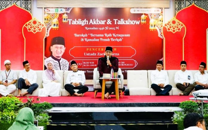 Bengkulu, CoverPublik.com – Dalam suasana penuh kehangatan dan kebersamaan, PJ Sekretaris Daerah (Sekda) Bengkulu, Herwan Antoni, bersama dai kondang Ustaz Zacky Mirza, Lc., serta Komunitas Riau Indonesia Mengaji, menghadiri Tabligh Akbar dan acara buka puasa bersama yang digelar oleh Otoritas Jasa Keuangan (OJK) Bengkulu, Jumat (14/3/2025).