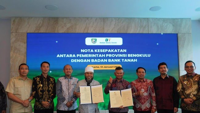 Kerja sama tersebut ditandai dengan penandatanganan nota kesepahaman antara Badan Bank Tanah dan Pemerintah Provinsi Bengkulu yang digelar di Nusantara Ballroom, Hotel Sari Pan Pacific, Jakarta Pusat, Selasa (13/1). Kolaborasi ini menjadi bagian dari upaya mendorong pembangunan dan investasi daerah melalui penataan serta pengelolaan tanah negara.