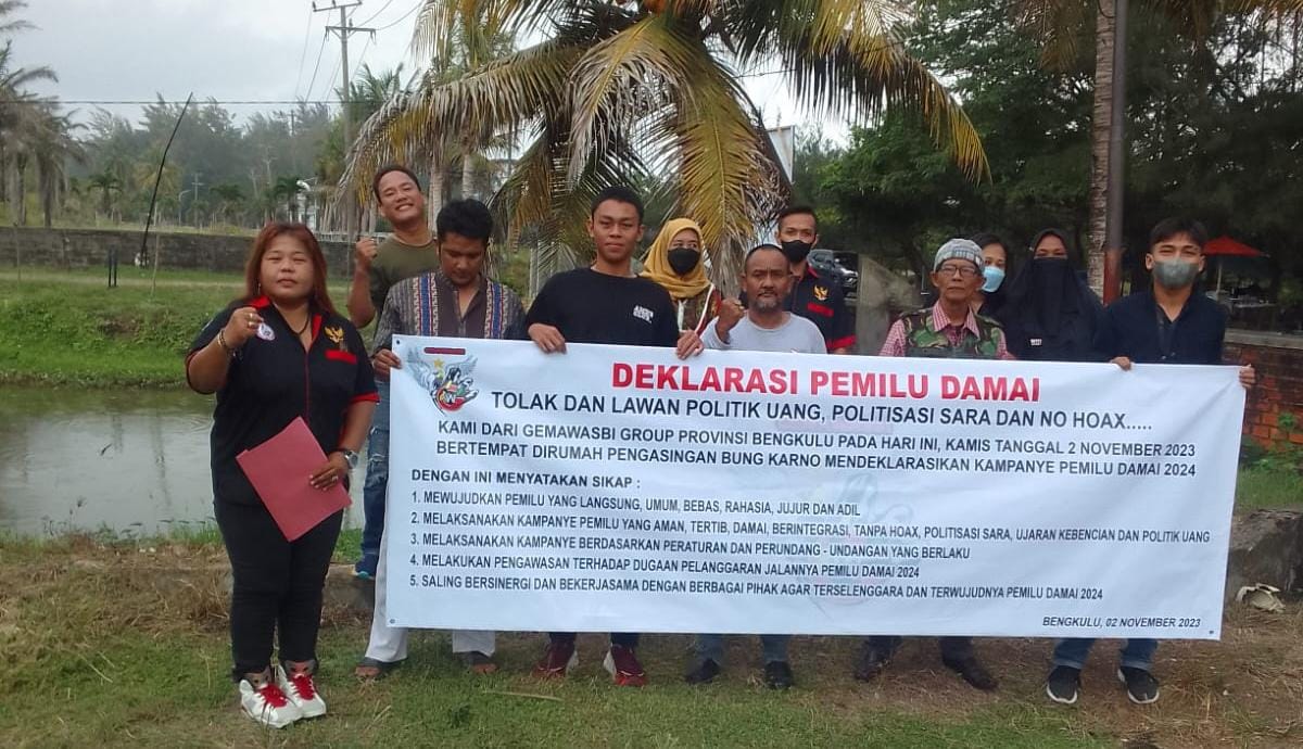 Kami dari Gemawasbi group provinsi bengkulu, pada hari ini kamis 2 November 2023, Bertempat di rumah pengasingan bung Karno mendeklarasikan pemilu damai 2024