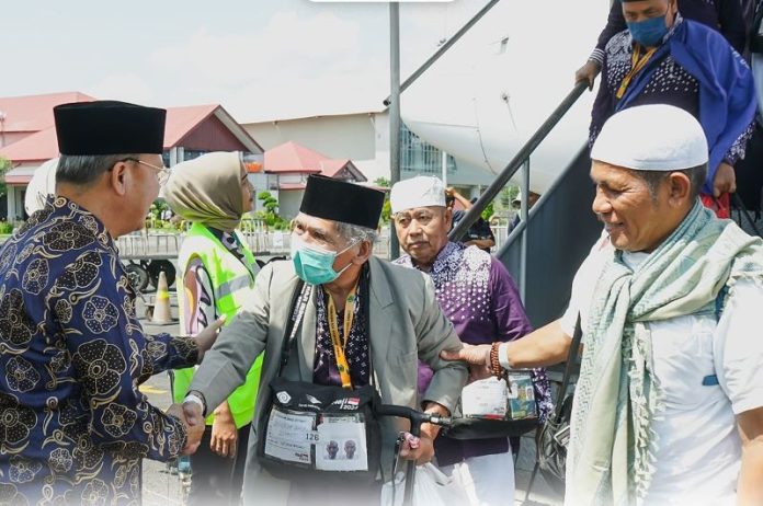 Gubernur Rohidin menyampaikan rasa syukurnya dan merasa bangga karena bisa menyambut langsung para tamu Allah yang baru saja menyelesaikan ibadah hajinya.