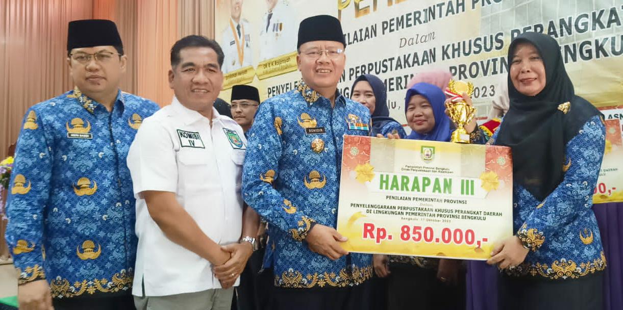 Hal tersebut disampaikan Gubernur Rohidin saat memberikan hadiah pemenang Perpustakaan Khusus Perangkat Daerah di Lingkungan Pemerintah Provinsi Bengkulu yang digelar oleh Dinas Perpustakaan dan Kearsipan Provinsi Bengkulu di Hotel Bougenville, Selasa (17/10/2023).