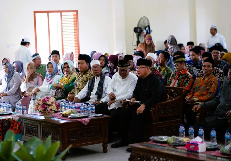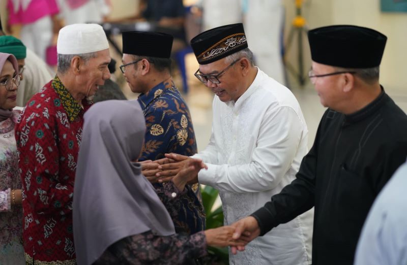 Mengenakan pakaian muslim serba hitam, Gubernur Rohidin disambut Ketua Umum IKJPP Provinsi Bengkulu M. Saleh.