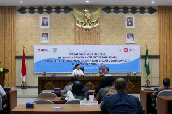 Coverpublik.com,Bengkulu – Rangkaian kegiatan Roadshow Bus KPK di Provinsi Bengkulu terus berlanjut. Pada hari ini kembali dilaksanakan kegiatan Sosialisasi Sistem Manajemen Anti Penyuapan (SMAP) di Gedung Pola Pemprov Bengkulu, Rabu (30/8/2023).