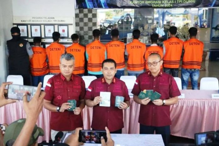“Tim FIQR Lanal Dumai dan Satgas Ops Koarmada I menangkap 24 WNA di Pesisir Pantai Pelintung, Kecamatan Medang Kampai, sedangkan dua lagi diserahkan oleh Polsek Medang Kampai,” kata Kepala Kantor Imigrasi Kelas I TPI Dumai, Ricky Rachmawan, melalui keterangan resmi, Sabtu (7/12/2024).