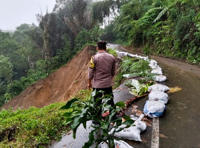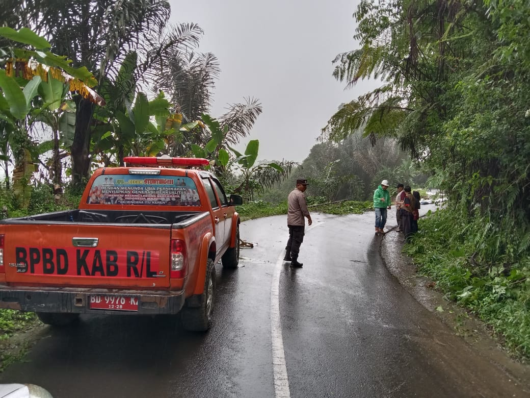 Mengetahui informasi tersebut, anggota piket Polsek Sindang Kelingi langsung menuju ke lokasi dan mendapati bahwa kondisi Tanah Longsor akibat curah hujan yang deras telah menutup sebagian badan jalan.