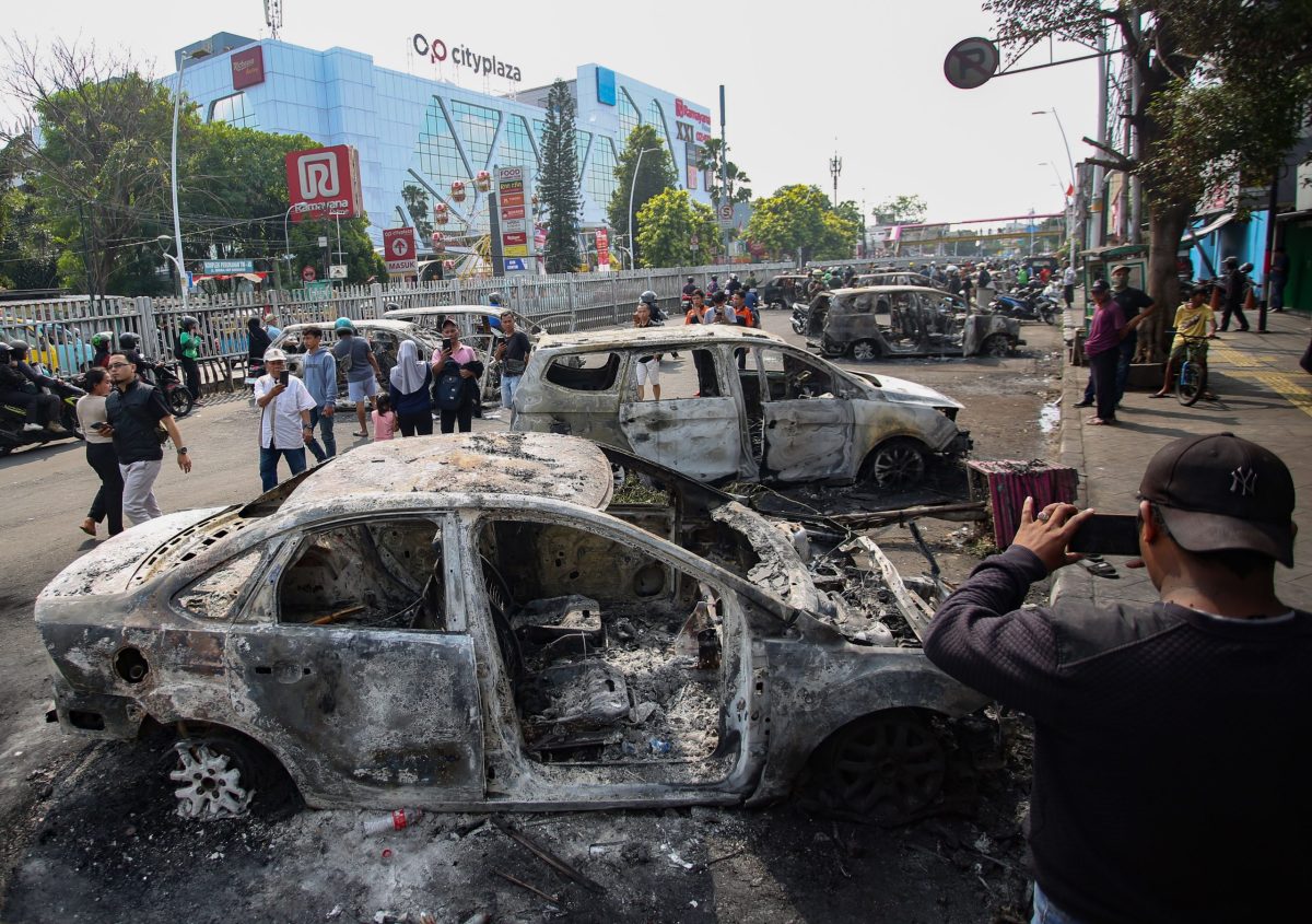 Warga mengamati sejumlah mobil yang hangus terbakar di Jalan Matraman, Jakarta Timur, Sabtu (30/8/2025). (Foto Dok. Antara)