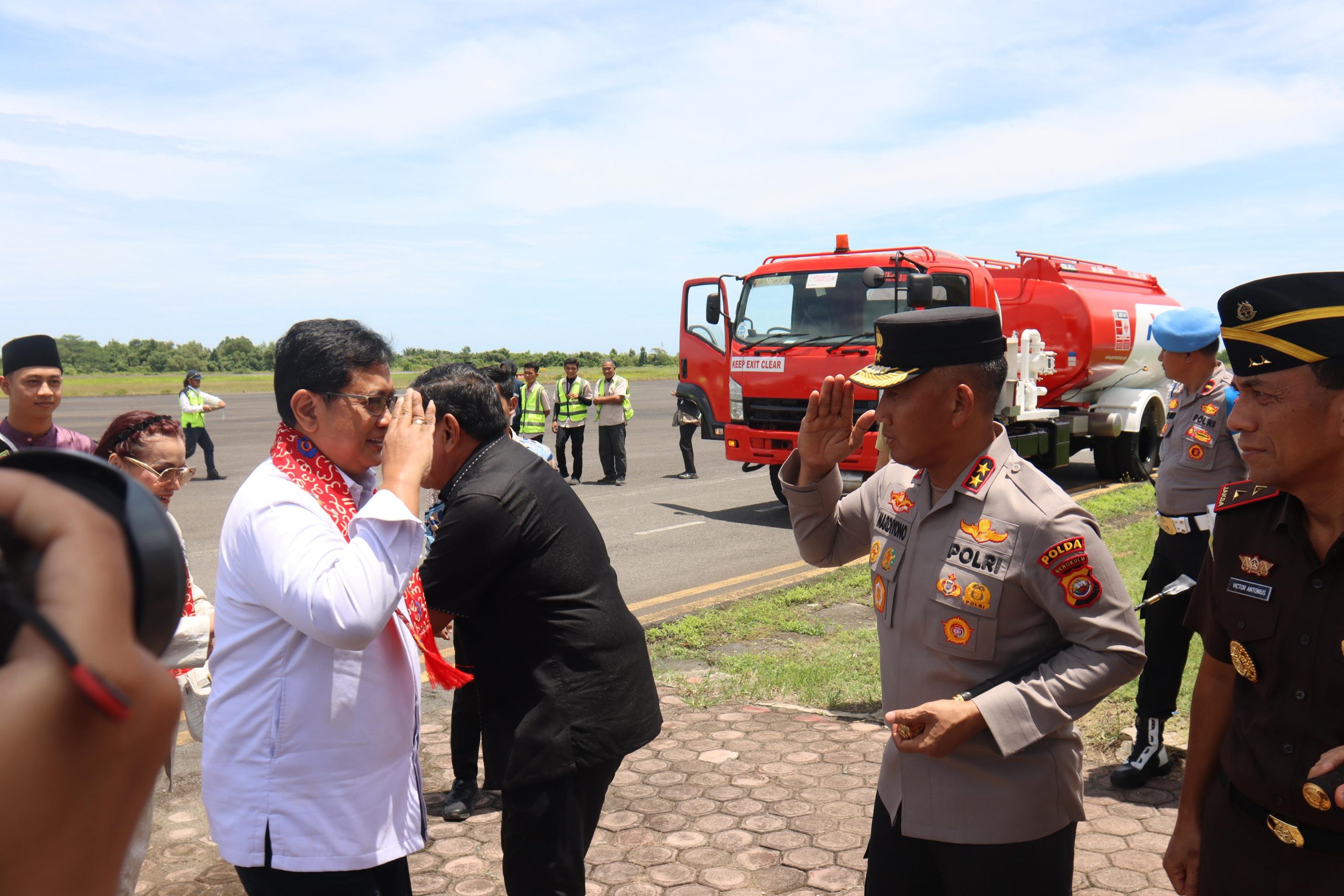 Bengkulu, Coverpublik.com – Suasana hangat tampak di Bandara Fatmawati Soekarno, Selasa (9/9/2025), saat Kapolda Bengkulu Irjen Pol. Mardiyono, S.I.K., M.Si. menyambut kedatangan Wakil Menteri Transmigrasi, Viva Yoga Mauladi, beserta istri. Rombongan tiba sekitar pukul 11.45 WIB dan langsung disambut Gubernur Bengkulu Helmi Hasan bersama jajaran Forum Koordinasi Pimpinan Daerah (Forkopimda) serta sejumlah pejabat organisasi perangkat daerah (OPD).