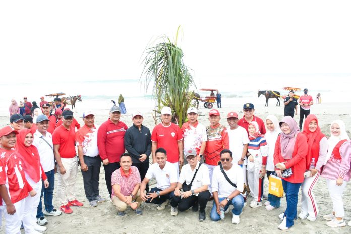 Meski hujan lebat mengguyur, semangat jajaran Polda Bengkulu, Pemkot Bengkulu, DPD REI Bengkulu, serta berbagai stakeholder dan masyarakat tetap membara. Bersama Walikota Dedy, Wakil Walikota Ronny, dan jajaran Forkopimda, Kapolda turun langsung menanam pohon kelapa berukuran sekitar 4 meter di kawasan ikon wisata “Pantai Panjang”, Minggu pagi (10/8).