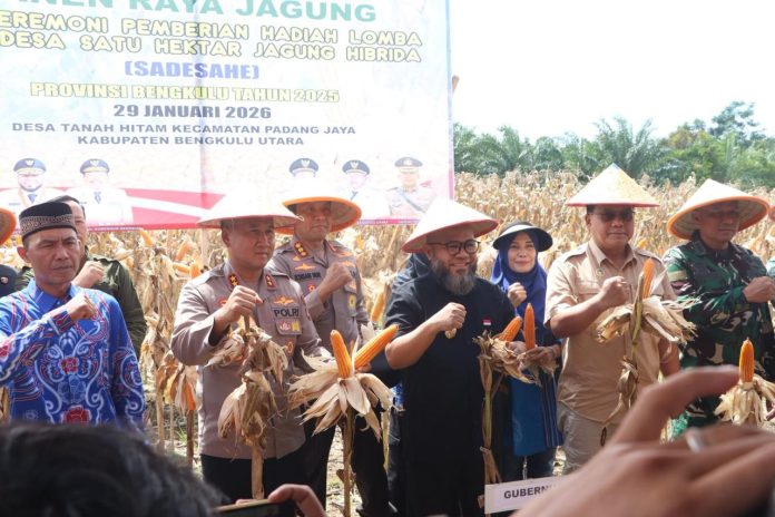 Bengkulu Utara, Coverpublik.com – Kapolda Bengkulu Irjen Pol. Mardiyono, S.I.K., M.Si., menghadiri kegiatan Panen Raya Jagung dan Seremoni Pemberian Hadiah Lomba Kegiatan Satu Desa Satu Hektar Jagung (SADESAHE) Provinsi Bengkulu Tahun 2025, sekaligus Launching Penanaman Umbi Uwi Ungu Polda Bengkulu, yang digelar di Dusun I Talang Pagar Alam, Desa Tanah Hitam, Kecamatan Padang Jaya, Kabupaten Bengkulu Utara, Kamis (29/1/2026).