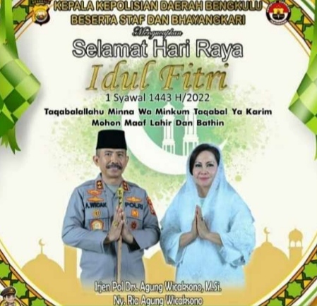 “Kepala Kepolisian Daerah Bengkulu Beserta Staf dan Bhayangkari mengucapkan Selamat Hari Raya Idul Fitri 1 Syawal 1443 Hijriyah. Taqabbalahu Minna Wa Minkum Taqabal Ya Karim, Mohon Maaf Lahir Dan Batin,” ucapnya melalui akun Instagram@polda_bengkulu.