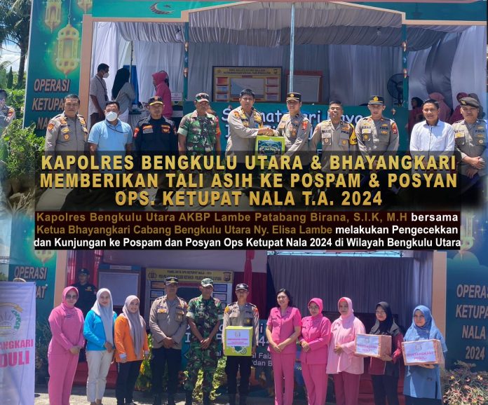 CoverPublik.com » Kapolres Bengkulu Utara AKBP Lambe Patabang Birana, S.I.K, M.H., bersama Ketua Bhayangkari Cabang Bengkulu Utara Ny. Ny. Elisa Lambe membagikan tali asih kepada personel yang bertugas di Pos Pengamanan dan Pos Pelayanan Lebaran Tahun 2024.