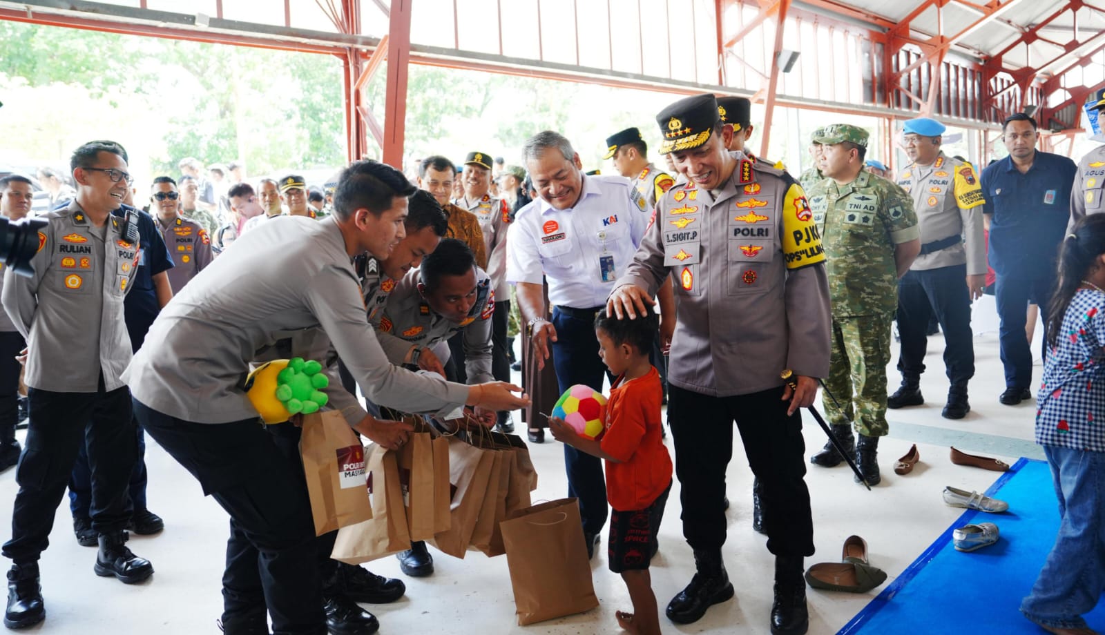 Kapolri juga menyempatkan diri menyapa para penumpang di ruang tunggu keberangkatan serta membagikan goodie bag sebagai bentuk perhatian dan dukungan kepada masyarakat yang akan melakukan perjalanan. Selain itu, Kapolri menyerahkan paket bantuan sosial secara simbolis kepada perwakilan petugas lintas sektor, meliputi unsur TNI, Polri, Dinas Perhubungan, tenaga kesehatan KAI, dan Polsuska.