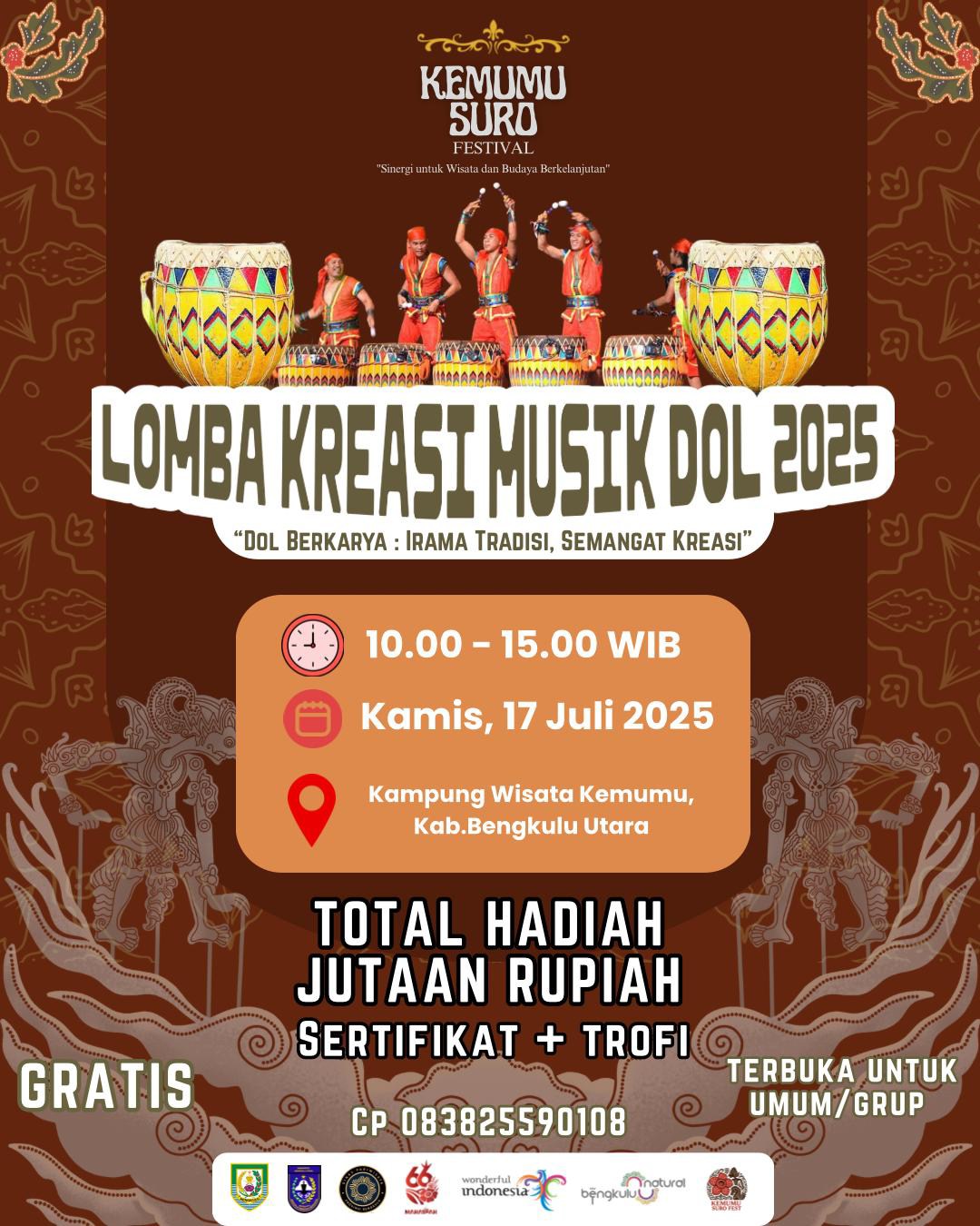 Tak kalah meriah, acara dilanjutkan dengan Lomba Kreasi Musik Dol 2025 bertajuk “Dol Berkarya: Irama Tradisi, Semangat Kreasi”. Lomba ini akan digelar pukul 10.00 hingga 15.00 WIB dan terbuka untuk umum maupun grup tanpa dipungut biaya pendaftaran.