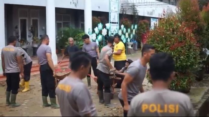 Sebagai bentuk kepedulian dan respons cepat terhadap kondisi tersebut, pada Senin (29/12/2025) personel Polres Langsa turun langsung ke lokasi memulai pembersihan. Dengan peralatan sederhana seperti cangkul, sekop, dan kereta dorong, personel Polri bersama para guru bergotong royong membersihkan lumpur di halaman dan ruang kelas agar sarana pendidikan dapat segera difungsikan kembali.