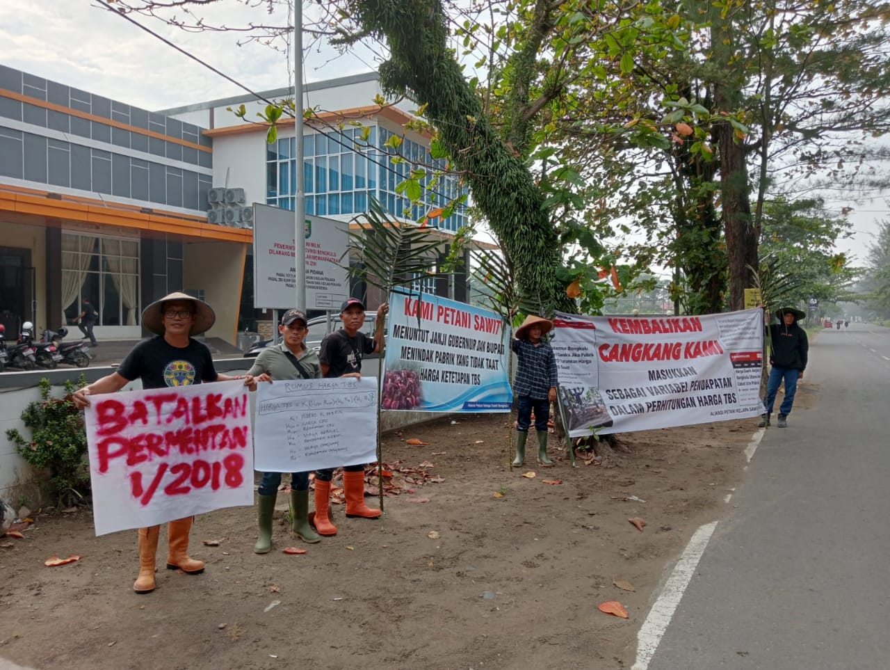 Coverpublik.com – Aliansi Petani Kelapa Sawit (APKS) Provinsi Bengkulu menggelar aksi protes di salah satu hotel di Kota Bengkulu, tempat pelaksanaan Penetapan Harga TBS Sawit, pada Selasa (18/7/23).