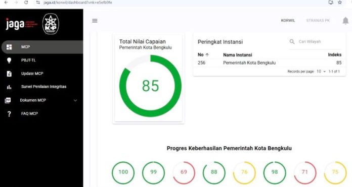 Bengkulu, CoverPublik.com – Selama 2024, Pemerintah Kota (Pemkot) Bengkulu komitmen mengakselerasi nilai realisasi Monitoring Centre for Prevention (MCP) Komisi Pemberantasan Korupsi (KPK) terkait capaian program pencegahan korupsi di Kota Bengkulu. Terbukti, pada 2024 angka MCP Kota Bengkulu mencapai nilai 85. Ini melampaui target awal pemerintah kota yakni sebesar 84 untuk tahun ini.