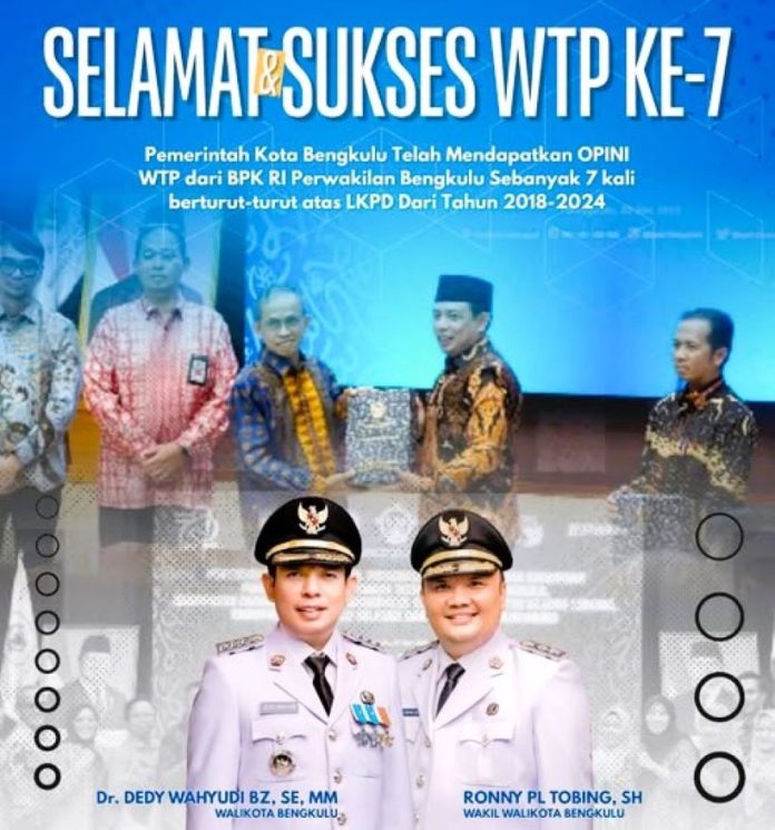BENGKULU, CoverPublik.com – Pemerintah Kota Bengkulu kembali menorehkan prestasi gemilang dengan meraih opini Wajar Tanpa Pengecualian (WTP) dari Badan Pemeriksa Keuangan (BPK) Provinsi Bengkulu atas Laporan Keuangan Pemerintah Daerah (LKPD) Tahun Anggaran 2024. Capaian ini menjadi kali ketujuh secara berturut-turut sejak tahun 2018.