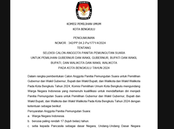 CoverPublik.com » Dalam rangka pembentukan Calon Anggota Panitia Pemungutan Suara untuk pemilihan Gubernur dan Wakil Gubernur, Bupati dan Wakil Bupati, dan Walikota dan Wakil Walikota pada pilkada serentak tahun 2024 di Kota Bengkulu, Komisi Pemilihan Umum (KPU) Kota Bengkulu mengundang Warga Negara Indonesia yang memenuhi kualifikasi untuk mendaftarkan diri untuk menjadi Panitia Pemungutan Suara (PPS) Tahun 2024.