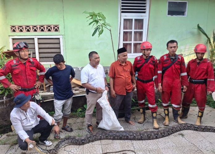 CoverPublik.com – Untuk kesekian kalinya tim rescue Dinas Pemadam Kebakaran dan Penyelamatan Kota Bengkulu melakukan evakuasi terhadap ular Phyton raksasa di Kota Bengkulu. Bila sebelumnya ular phyton dievakuasi dari Hotel Grage/Horizon, kali ini petugas damkar mengevakuasi ular dengan jenis yang sama di Hotel Gumay, Tanah Patah.