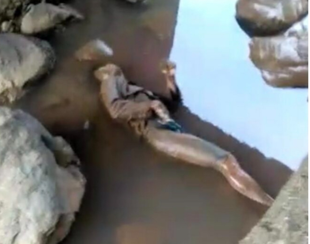 Mayat tersebut dalam posisi terbaring kesebelah kanan dibawah jembatan dan tergenang air menggunakan celana warna biru setengah tiang dan baju kemeja berwarna coklat.
