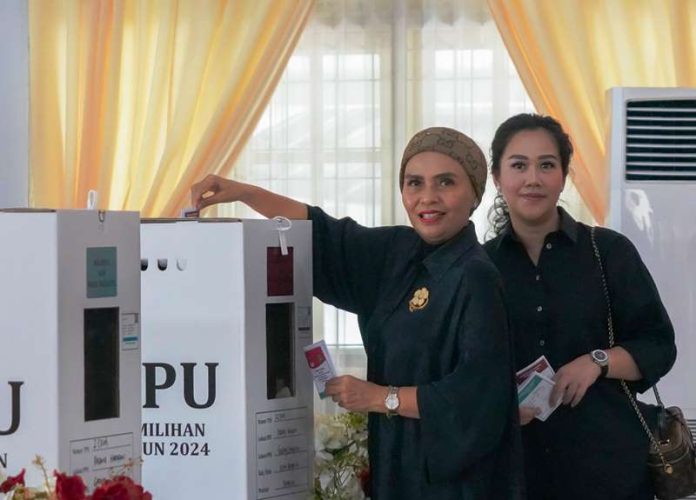 CoverPublik.com – Calon Wakil Gubernur Bengkulu, Meriani menggunakan hak pilihnya di TPS 02 Padang Harapan, Rabu (27/11/24). Dengan didampingi sang anak, Meriani menunjukkan keyakinannya peluang besar pasangan calon ROMER meraih kemenangan besar dalam Pilgub 2024.