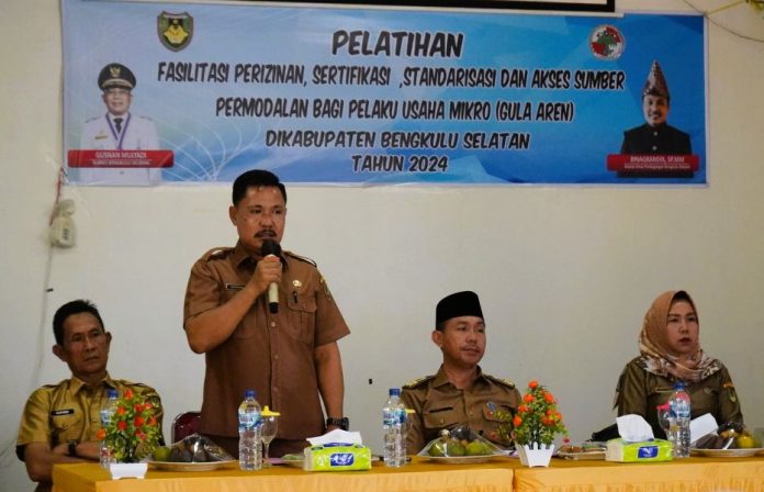 CoverPublik.com » Pemerintah Daerah Bengkulu Selatan melaui Dinas Perindagkop menyelenggarakan pelatihan terkait Fasilitasi Perizinan, Sertifikasi, Standarisasi dan Akses Sumber Permodalan Bagi Pelaku UMKM Gula Aren. Kegiatan yang dilaksanakan di Aula Pertemuan Water Park ini dibuka oleh Sekretaris Daerah Sukarni, S.P., M.Si. Senin (13/5/24).