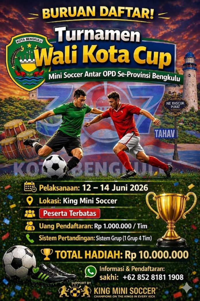 Bengkulu, CoverPublik.com – Turnamen mini soccer bertajuk Wali Kota Cup antar Organisasi Perangkat Daerah (OPD) se-Provinsi Bengkulu resmi membuka pendaftaran peserta. Ajang olahraga ini dijadwalkan berlangsung pada 12 hingga 14 Juni 2026.