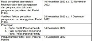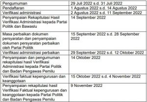 Informasi lebih lanjut, mengenai tahapan verifikasi, KPU akan melaksanakanverifikasi pada jadwal yang telah ditetapkan pada PKPU No. 4 Tahun2022sebagaimana berikut: