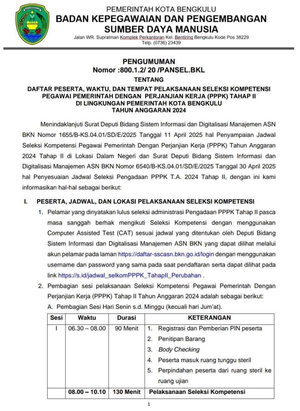 BKPSDM Kota Bengkulu mengimbau agar para peserta selalu memantau informasi resmi dan tidak terpancing oleh informasi yang tidak jelas sumbernya. Seluruh proses seleksi tidak dipungut biaya apa pun dan dilakukan secara transparan berbasis sistem Computer Assisted Test (CAT).