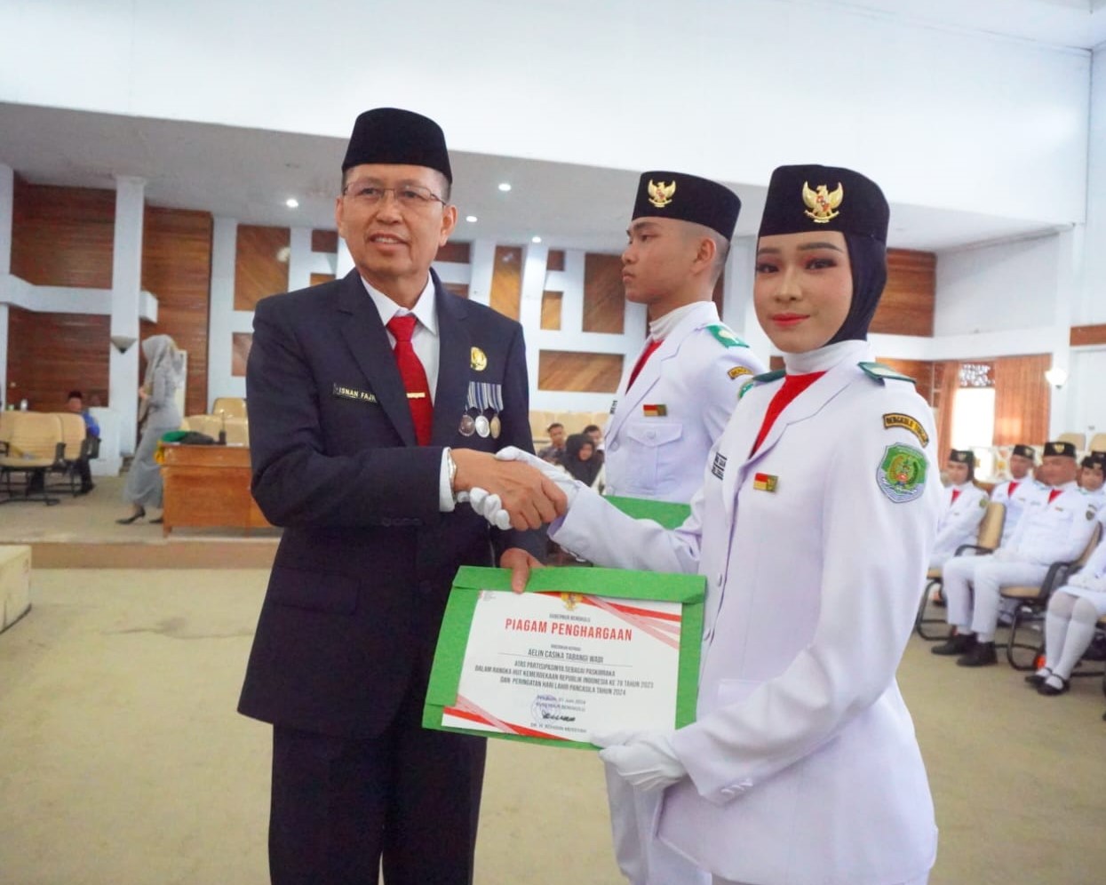 CoverPublik.com – Sekda Provinsi Bengkulu Isnan Fajri secara resmi membubarkan 54 anggota Pasukan Pengibar Bendera Pusaka (Paskibraka) tingkat Provinsi Bengkulu tahun tugas 2023, di Gedung Serbaguna Provinsi Bengkulu, Sabtu (01/06).