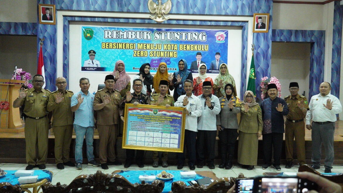 Pj Sekda bersama seluruh pihak terkait melakukan penandatanganan sebagai bentuk komitmen bersama Pemkot Bengkulu dan pemangku kepentingan pada pelaksanaan percepatan penurunan stunting di Kota Bengkulu tahun 2024.