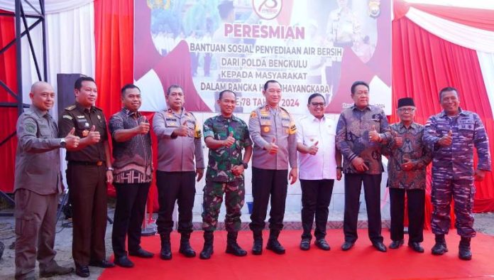 CoverPublik.com – Penjabat (Pj) Walikota Bengkulu Arif Gunadi bersama Kapolda Bengkulu Irjen. Pol. Drs. Armed Wijaya meresmikan bantuan sumur bor di Masjid Al Iman Jalan Hibrida 9A, Kelurahan Sidomulyo, Kecamatan Gading Cempaka, Kota Bengkulu, Penyaluran bantuan sumur bor tersebut dalam rangka HUT Bhayangkara ke 78 Tahun.