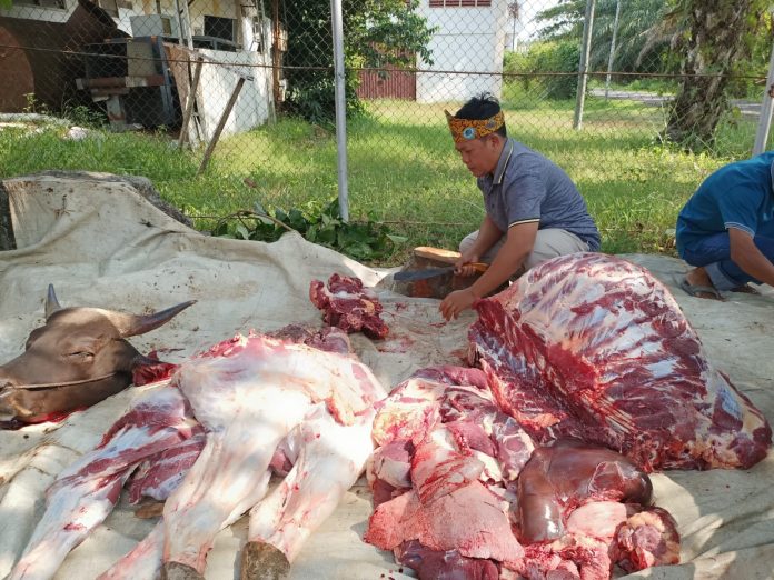 Pemotongan hewan kurban dilakukan secara simbolis oleh Eksekutif General Manager AP II KC Bandara Fatmawati Soekarno Bengkulu Ngatimin K Murtono bersama jajarannya dan melakukan pemaketan untuk dibagikan langsung kepada masyarakat.
