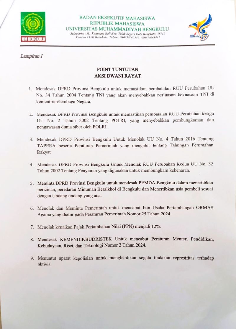 Rusman Tobyakta S selaku Ketua BEM UMB mangatakan, bahwa Aksi demo tersebut sebagai respons terkait dengan RUU TNI, kembalinya Dwi fungsi ABRI, Revisi kinerja Polri, Kebijakan Tabungan Perumahan Rakyat (Tapera), Kenaikan PPN 12 %, Mencabut Izin Usaha Pertambangan (IUP) Ormas beragama, serta Peredaran alkohol di Bengkulu.