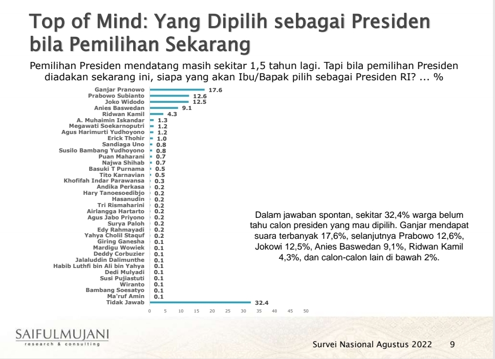 Hasil survey Saiful Mujani Research Centre (SMRC) Agustus terbaru, presentase Ketum PRIMA berhasil mengalahkan beberapa Ketum Partai yang sudah mapan di Parlemen seperti Ketum Nasdem, Ketum PAN, Ketum PPP dan juga PKS. Bahkan hasil survei presentase Ketum PRIMA angkanya = Ketum Golkar, Airlangga Hartato.