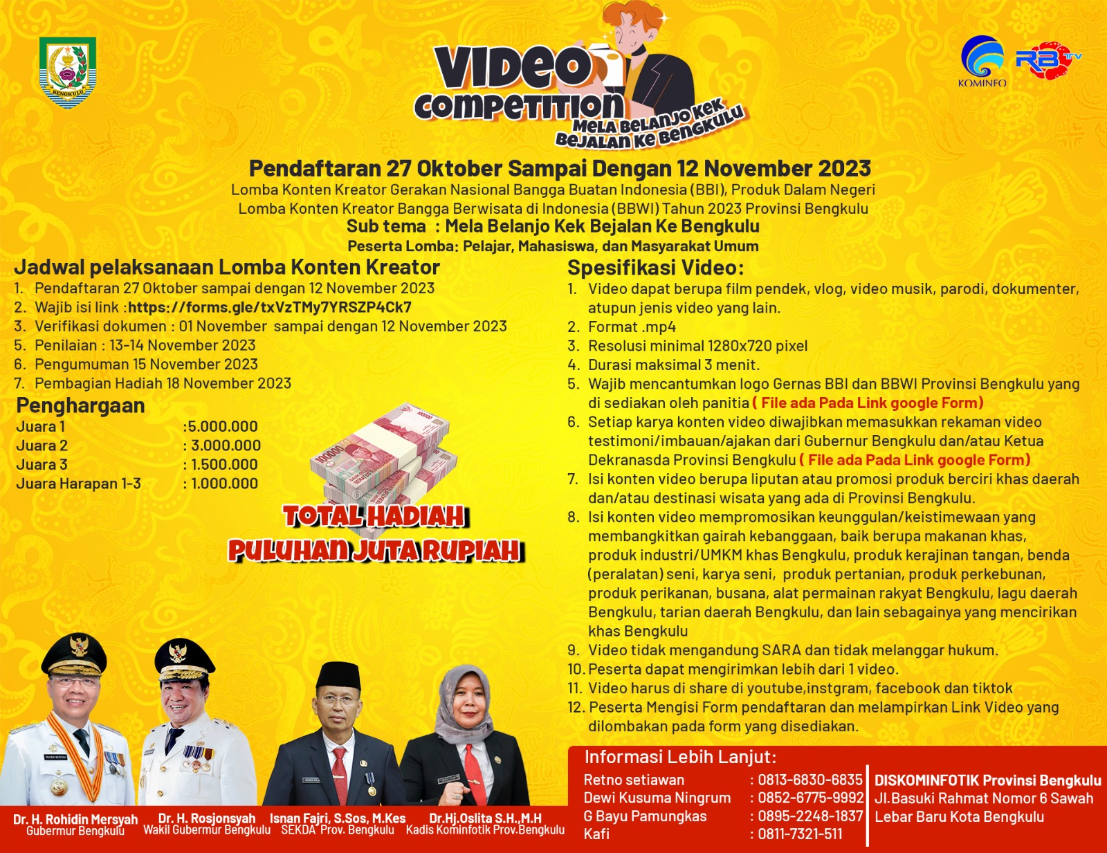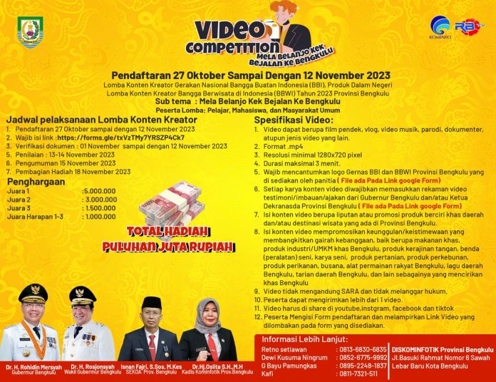 Coverpublik.com,Bengkulu- Kabar gembira bagi masyarakat provinsi Bengkulu bahwasanya dinas kominfotik provinsi Bengkulu gelar Lomba konten kreator gerakan nasional bangga buatan Indonesia ( BBI ) produk dalam negeri dan konten kreator bangga berwisata di Indonesia ( BBWI ) tahun 2023 provinsi bengkulu.