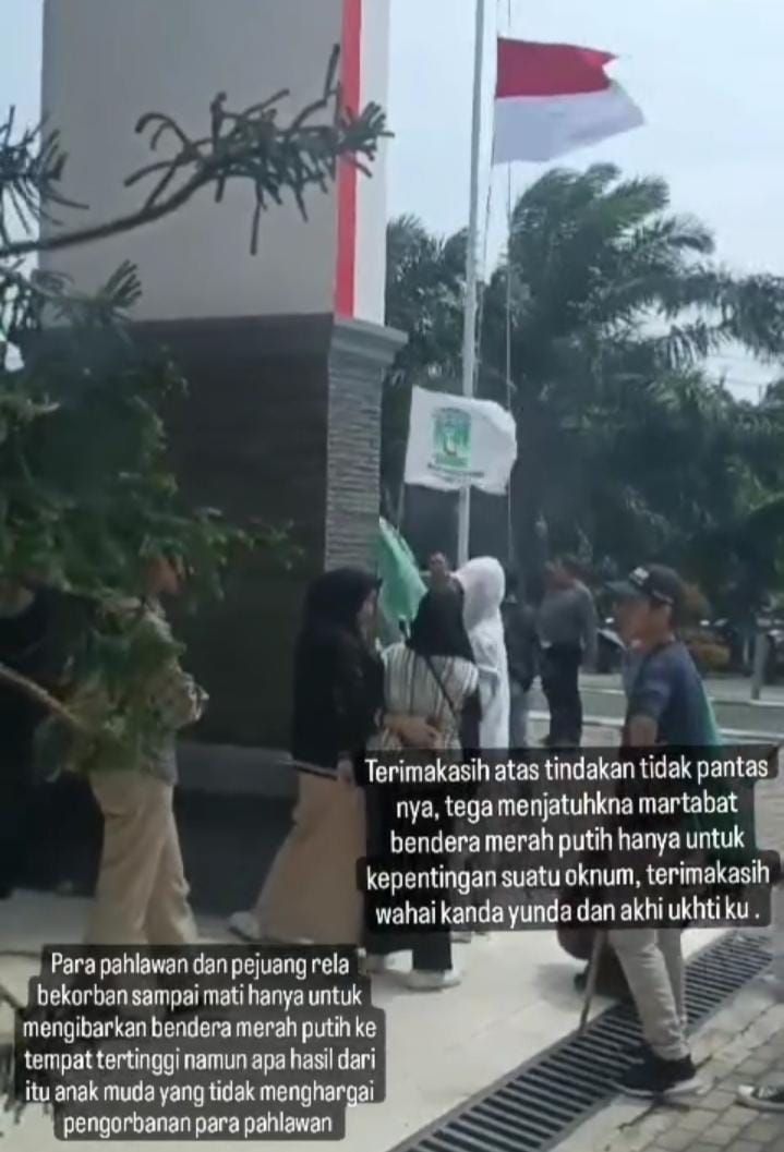 Kemudian, video beredar di media sosial. Terlihat salah satu oknum massa saat aksi dihalaman Rektorat itu menurunkan Bendera setengah tiang.
