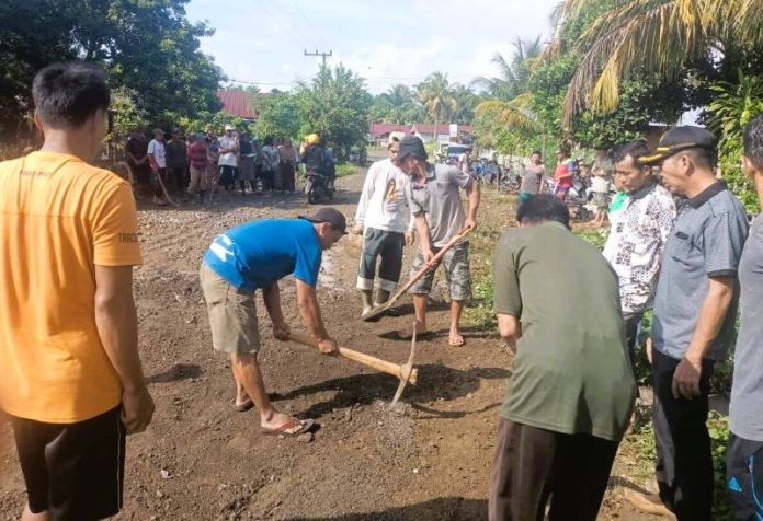“Kita selesaikan hari ini, biar jalan yang berlobang aman untuk dilalui,” ajak salah satu warga, kepada warga yang lain yang tengah bekerja.